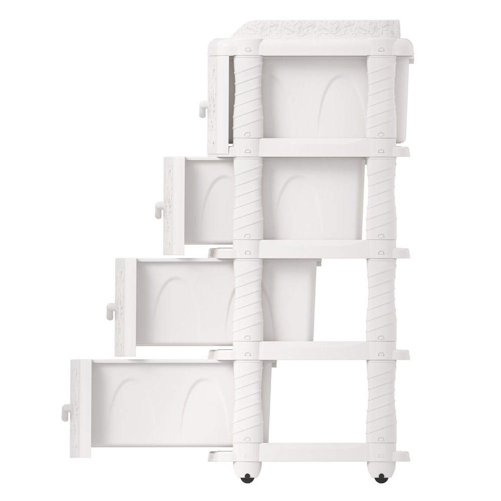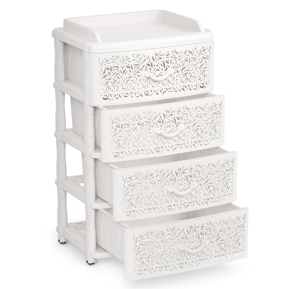 Четыре широких выдвижных ящика большой вместимости, где вы сможете удобно хранить личные вещи и другие принадлежности. Благодаря небольшому весу комод легко передвигается, обеспечивая удобство использования.