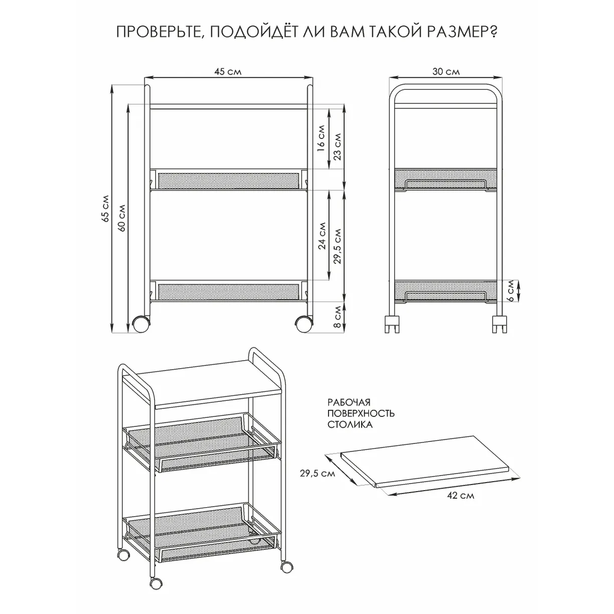 Металлическа этажерка Ладья 33КС от бренда ЗМИ - идеальное решение для организации пространства в вашем доме! Эта универсальная мебель подойдет для использования в любой комнате. Благодаря своим компактным размерам, она легко помещается в узких местах, при этом обеспечивая прекрасное хранение различных вещей. Ладья 33КС имеет 2 прочные и широкие металлические корзины в мелкую сетку и столик из стального листа, которые позволяют вам организовать все необходимые предметы на кухне, ванной комнате или прихожей. Этажерка также может быть использована как стеллаж для косметологических средств или как тележка для перевозки различных предметов. Стоит отметить, что расстояние между нижними корзинами увеличено для возможности хранить более высокие предметы. Изготовленная из железного металла, эта этажерка гарантирует долговечность и надежность в использовании. Она прекрасно сочетается с любым интерьером благодаря своему стильному дизайну и универсальности. Так-же в комплекте с Ладьей 33КС вы найдете удобный крючок для хранения различных небольших аксессуаров. Позвольте себе стать настоящим мастером хранения с этой металлической этажеркой от ЗМИ! Мы не рекомендуем использовать изделие в условиях постоянной влажности (складывать влажные полотенца, сырые банки, заливать водой). Изделие продается в разобранном виде в картонной коробке с ручкой, за которую удобно донести покупку от пункта выдачи до дома. Сборка осуществляется без инструмента по простой и понятной схеме сборки.
