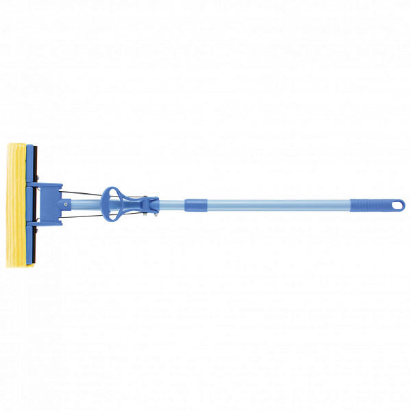 Швабра с металлической ручкой длиной 115 см, с пластиковым основанием и механизмом отжима с помощью роликов с каждой стороны.